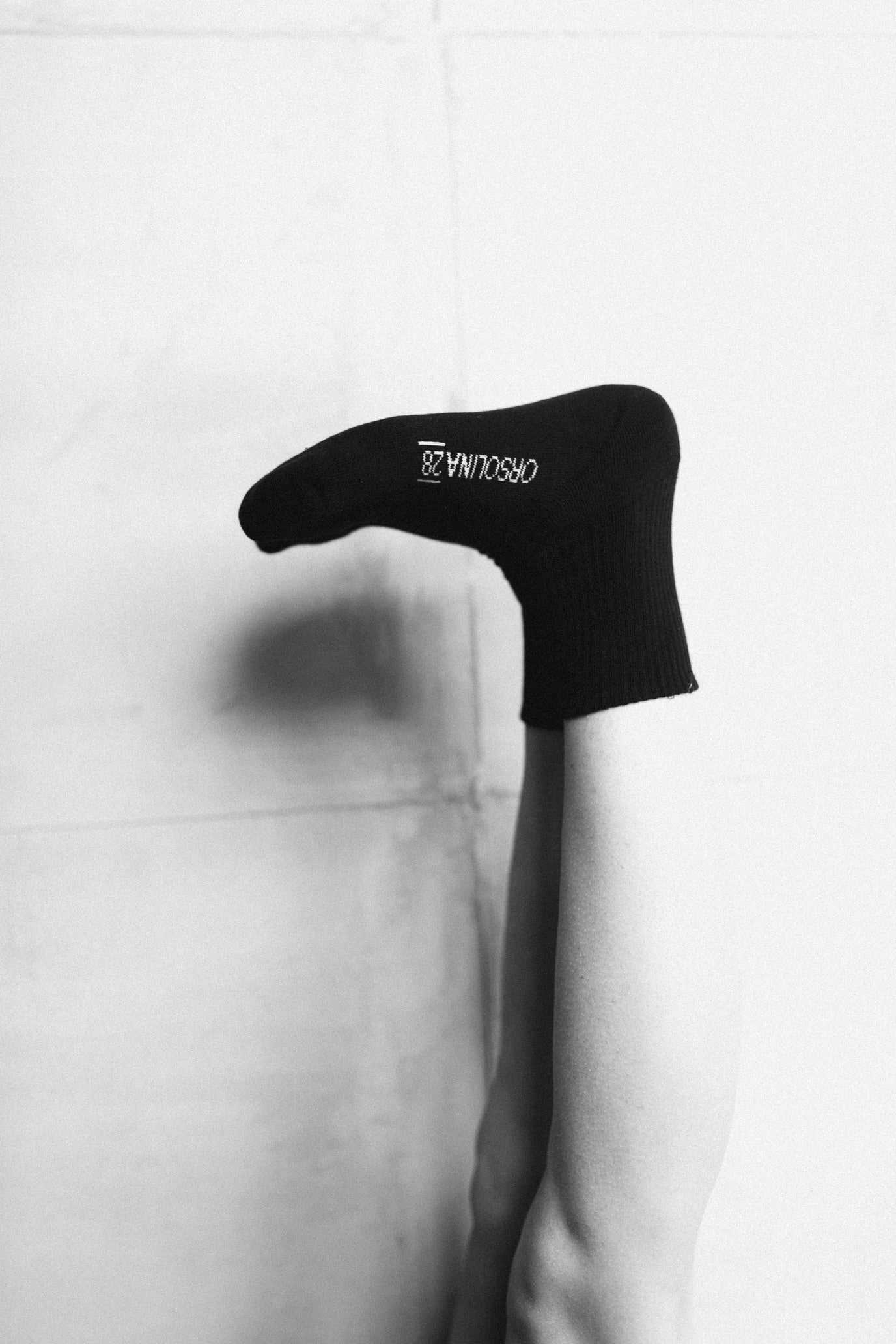 Calzini neri con logo di Orsolina28 Art Foundation ricamato sul lato del piede.