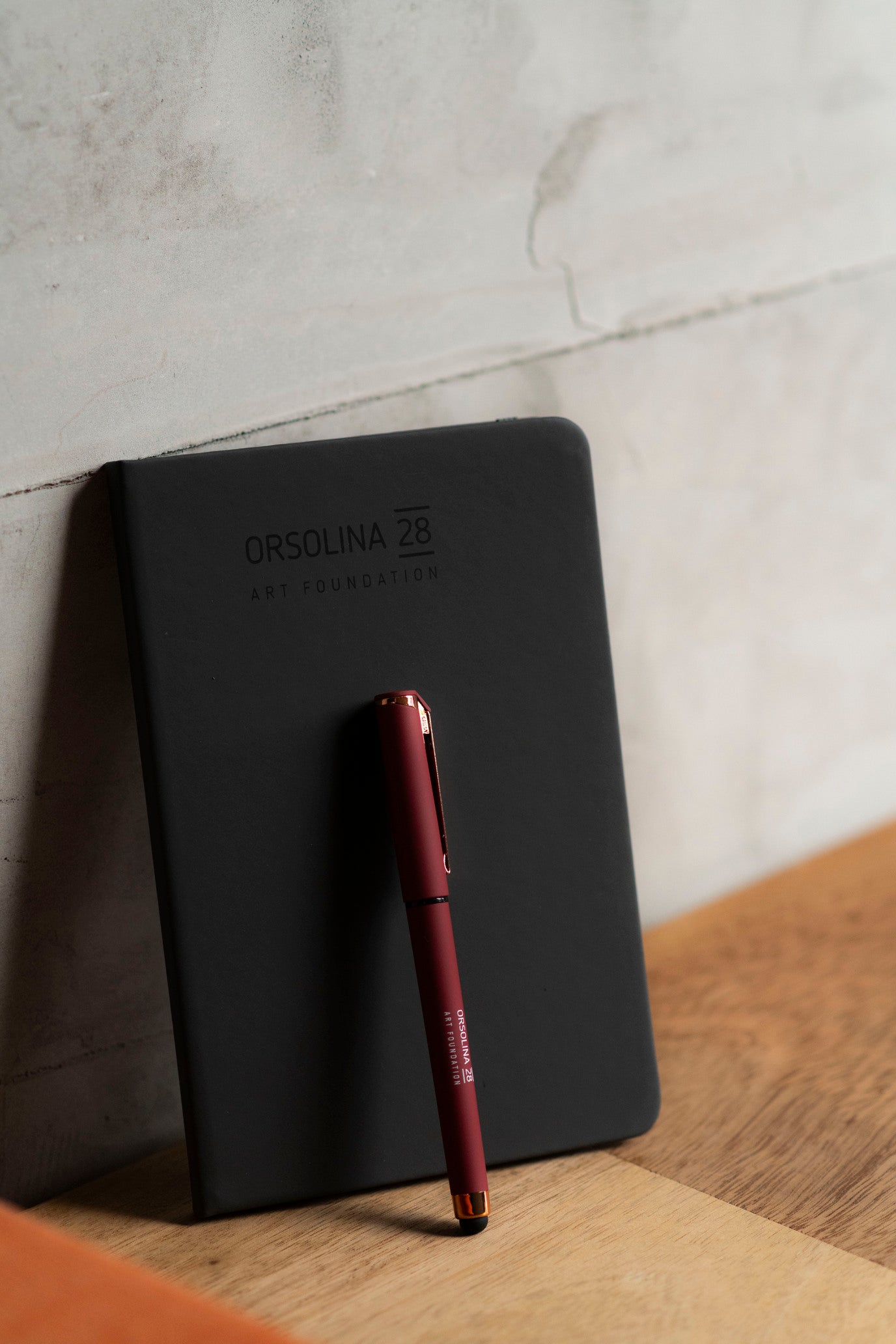 Penna gel bordeaux con logo Orsolina28 Art Foundation rifinito in oro rosa.